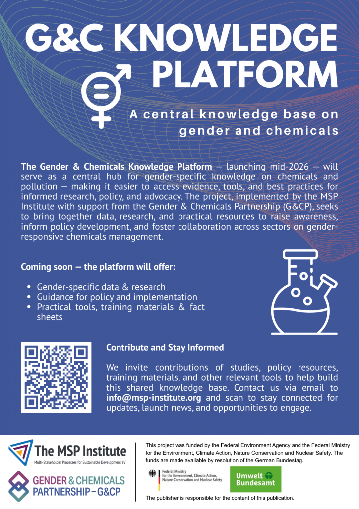 Since September 2025 the MSP Institute has started with its project “G&C Knowledge Platform”. The project aims to create a new platform that brings together research, gender-specific data, and practical tools on the links between gender and chemicals.